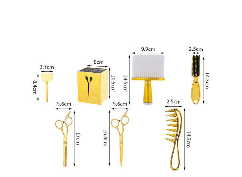 Dental scissors + flat scissors + storage bucket + hair brush + beard brush + squeezer + large tooth comb X1