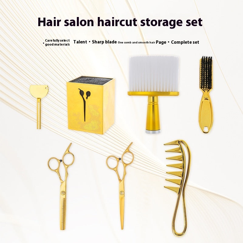 Dental scissors + flat scissors + storage bucket + hair brush + beard brush + squeezer + large tooth comb X1